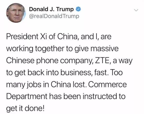 “習(xí)主席和我正在合作,試圖讓中國最大的手機(jī)廠商之一中興通訊盡快重返市場。”特朗普在推文中表示,“對中興通訊的貿(mào)易禁令會導(dǎo)致大量工作崗位的流失。我已責(zé)令美國商務(wù)部盡快妥善處理!”