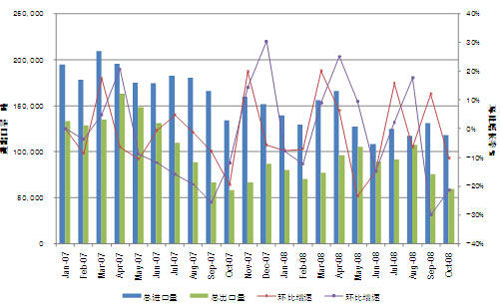 從進出口統(tǒng)計數(shù)據(jù)來看,國家針對不銹鋼產(chǎn)品進出口政策的調(diào)整顯然對08年不銹鋼進出口尤其是出口量產(chǎn)生了很大的影響,08年5月份后由于進出口訂單的延緩執(zhí)行,進出口量并未明顯減少,而10月份不銹鋼進出口量開始明顯減少,從08年前10月統(tǒng)計數(shù)據(jù)來看,進出口的主要品種板卷、碎料、帶材、管材同比均有不同程度的減少,這也充分反應(yīng)了國內(nèi)不銹鋼需求的疲弱形勢。