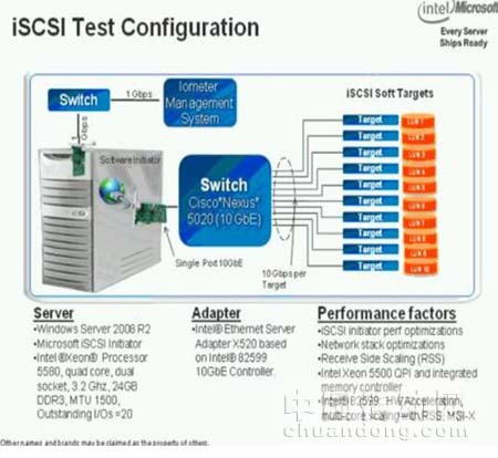 Webcast 上提到會(huì)有一份針對(duì)這次測(cè)試詳細(xì)配置說(shuō)明的白皮書(shū)發(fā)布,但是到目前為止我還沒(méi)有看到。但是據(jù)我估計(jì),此次測(cè)試使用了超過(guò)100塊高性能硬盤(pán)。也就是說(shuō),并不是每個(gè)人都有必要采用10-Gigabit以太網(wǎng)適配器,并達(dá)到這么高的吞吐量。這個(gè)數(shù)字只是用來(lái)證明當(dāng)前采用的Nehalem處理器,最新的intel網(wǎng)絡(luò)接口以及軟件iSCSI initiator能夠?qū)崿F(xiàn)這么高的性能而已。另外,目前有人需要這么高的I/O性能嗎?我認(rèn)為沒(méi)有。