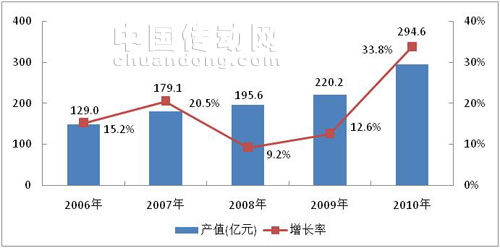 自國(guó)家半導(dǎo)體照明工程實(shí)施以來(lái),中國(guó)LED產(chǎn)業(yè)取得了長(zhǎng)足的發(fā)展。2008年,全球金融危機(jī)導(dǎo)致下游市場(chǎng)需求疲軟,在一定程度上減緩了中國(guó)LED產(chǎn)業(yè)的發(fā)展速度。進(jìn)入2009年,隨著國(guó)家不斷出臺(tái)相關(guān)扶持政策,中國(guó)LED產(chǎn)業(yè)增速企穩(wěn)回升。2010年,在LED全彩顯示、LED背光源、LED照明等下游應(yīng)用高速發(fā)展的拉動(dòng)下,包括襯底、外延、芯片、封裝在內(nèi)的中國(guó)LED產(chǎn)業(yè)規(guī)模高速增長(zhǎng)到294.6億元,比2009年大幅增長(zhǎng)33.8%。2006-2010年,中國(guó)LED產(chǎn)業(yè)年均復(fù)合增長(zhǎng)率達(dá)到18.7%。
