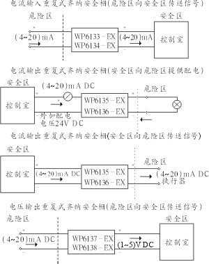 特點(diǎn): 防爆標(biāo)志:[Exia] ⅡC 溫度漂移:0.01% F.S/℃ 負(fù)載電阻:≤300Ω(恒流源的電壓為24V時(shí)) 適用現(xiàn)場(chǎng)設(shè)備:二線制變送器、執(zhí)行器和其它需要(4~20)mA DC電流信號(hào)的設(shè)備。 WP6100-EX電流輸入、輸出重復(fù)式齊納安全柵它能防止危險(xiǎn)能量從本安端子串入到危險(xiǎn)場(chǎng)所,并將( 4~20)mA DC信號(hào)經(jīng)限能后線性地轉(zhuǎn)換成 (4~20) mA DC 信號(hào)輸出(見(jiàn)功能示意圖)它不同于其它齊納安全柵的是當(dāng)危險(xiǎn)能量恢復(fù)后,能自動(dòng)恢復(fù)正常工作。 產(chǎn)品特點(diǎn) 防爆標(biāo)志:[Exib] ⅡC 危險(xiǎn)區(qū)輸入信號(hào):(4~20)mA DC 安全區(qū)輸出信號(hào):(4~20)mA DC 負(fù)載電阻:≤300Ω(恒流源的電壓為24V時(shí)) 溫度漂移:0.01% F.S/℃ 連續(xù)工作溫度:(-10~+60)℃ 國(guó)家防爆電氣產(chǎn)品質(zhì)量監(jiān)督檢驗(yàn)中心 (CQST)認(rèn)證參數(shù) (9、10、13、14、端子間): U0:30V、I0:26mA、C0:0.04μF、L0:1.0mH、P0:0.78W、Um:250V DC/AC 適用現(xiàn)場(chǎng)設(shè)備: 二線制變送器、執(zhí)行器和其它需要(4~20)mA DC電流信號(hào)的設(shè)備。 功能示意圖 儀表接線圖 儀表選型