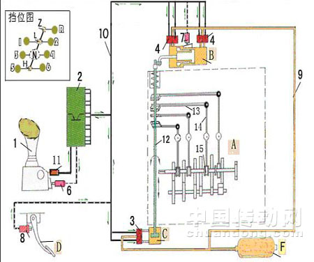 該系統(tǒng)的工作原理見圖3: 當汽車駕駛員踏下安裝在駕駛室中的離合器腳踏板D,到離合器完全分離位置時,用螺栓固聯(lián)在駕駛室底板上、位于離合器腳踏板側面的電磁式離合器位置感應器8,便產(chǎn)生磁感信號。此磁感信號轉換成電子信號,傳到用螺栓固聯(lián)在駕駛室中的主控制盒2(電子控制單元‘ECU’);與此同時,主控制盒2也接收到用螺栓固聯(lián)在駕駛室底板上的手操縱器1內(nèi)電磁式擋位感應器6的‘擋層’、‘擋位’電子信號。這些電子信號經(jīng)主控制盒處理后,經(jīng)電纜10傳遞到用螺栓固聯(lián)在變速器A上的電磁閥組中相應的‘擋層’電磁閥3、‘擋位’電磁閥4,從而開啟相應的氣閥孔,使來自安裝在車架上的儲氣筒F的壓縮空氣,經(jīng)氣管9流進用螺栓固聯(lián)在變速器蓋上相應的‘擋層’氣缸C、‘擋位’氣缸B。壓縮空氣推動‘擋層’氣缸C中的活塞移動?;钊寐菁y聯(lián)接安裝在變速器蓋中換擋軸12的一端,并用防松螺母固緊?;钊妮S向移動帶動換擋軸12移動到相應的‘擋層’(L)或(N)或(H)或(Z);隨之壓縮空氣流入用螺栓安裝在變速器蓋上的‘擋位’氣缸B中,壓縮空氣推動氣缸B中的活塞移動?;钊麠U的一端與換擋搖臂的一端鉸接,換擋搖臂的另一端通過花鍵聯(lián)接安裝在換擋軸上。因而活塞移動通過活塞桿帶動換擋搖臂擺動,從而推動變速器A中換擋軸12轉動,進而驅動與換擋軸鉸接的換擋拉板13,推動相應的撥叉14-同步器15掛上相應的‘擋位’1擋或2擋或3擋或4擋或5擋或6擋或倒擋(R)。安裝在‘擋位’氣缸B中的電磁感應器7將掛上擋的磁感信號經(jīng)主控制盒2反饋到用螺栓安裝在手操縱器1內(nèi)的電磁鎖11,電磁鎖開啟使換擋手柄移到掛入的擋位。